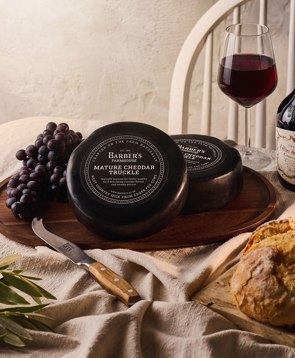 Made using traditional starter cultures and techniques, our Farmhouse Waxed Truckles are matured for 12 months then enveloped in black wax.