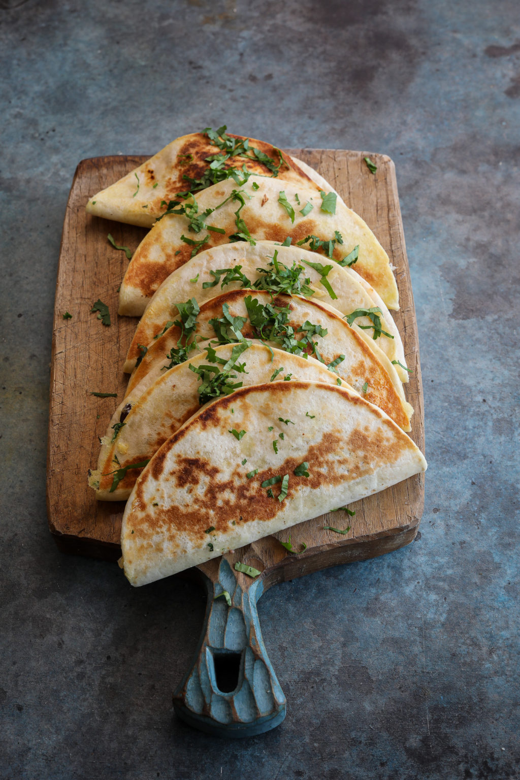 Fold over and cook with a little oil for 2-3 mins each side until the tortilla crisps up and browns whilst the cheese inside melts. Serve with extra chopped coriander.